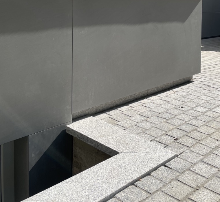 Kwarcyt, granit i tynk. To wystarczy aby wpisać się w otoczenie delikatnie zaznaczając swoją odrębność.