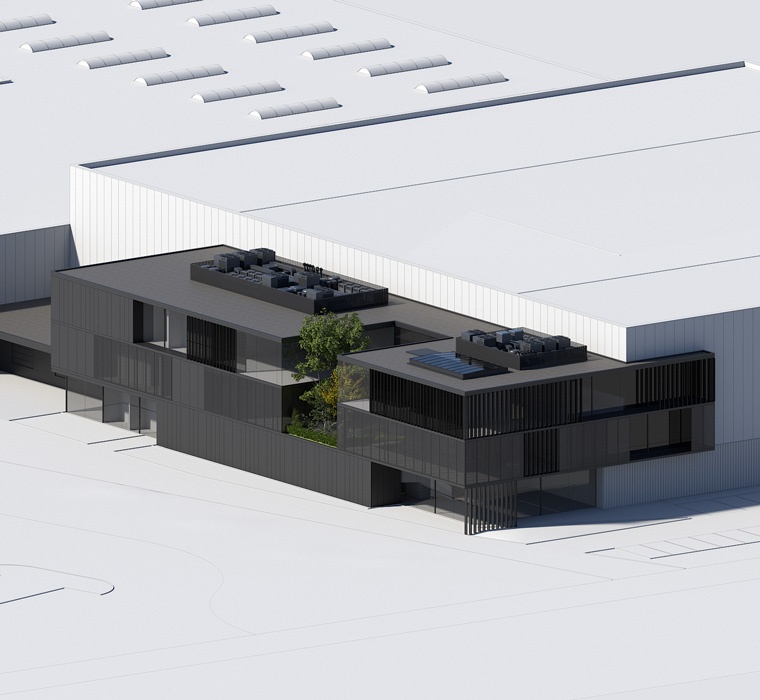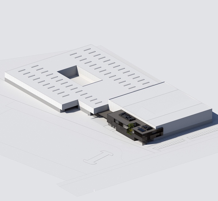 By przełamać jednolitość bryły, segment biurowy został świadomie wprowadzony w głąb części mroźni, co podkreśla dialog między funkcjami.
